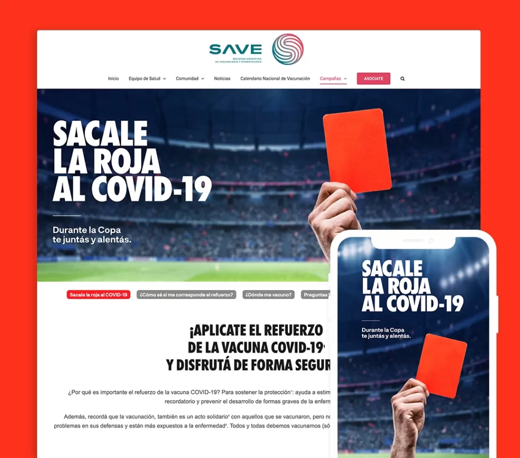 Sacale la roja al Covid-19 Sobre este proyecto Campaña de refuerzo de la vacuna COVID-19 en el marco del mundial de fútbol para la SAVE (Sociedad Argentina de Vacunología y Epidemiología). Año 2022. Tecnologías: HTML/CSS/Javascript Ver este proyecto